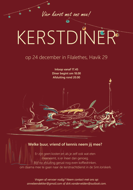 Vier kerst met ons mee tijdens onze kerstmaaltijd! Net als voorgaande jaren staan op kerstavond dinsdag 24 december vanaf 17.45 de deuren van Filalethes open voor iedereen in Amersfoort die zin heeft in een heerlijke maaltijd en gezelligheid. Welke buur, vriend of kennis neem jij mee? Er zijn geen kosten en aanmelden hoeft niet. Als je zelf wat eten meeneemt, is er meer dan genoeg. We beginnen de maaltijd rond 18.00 en sluiten rond 20.00 af.